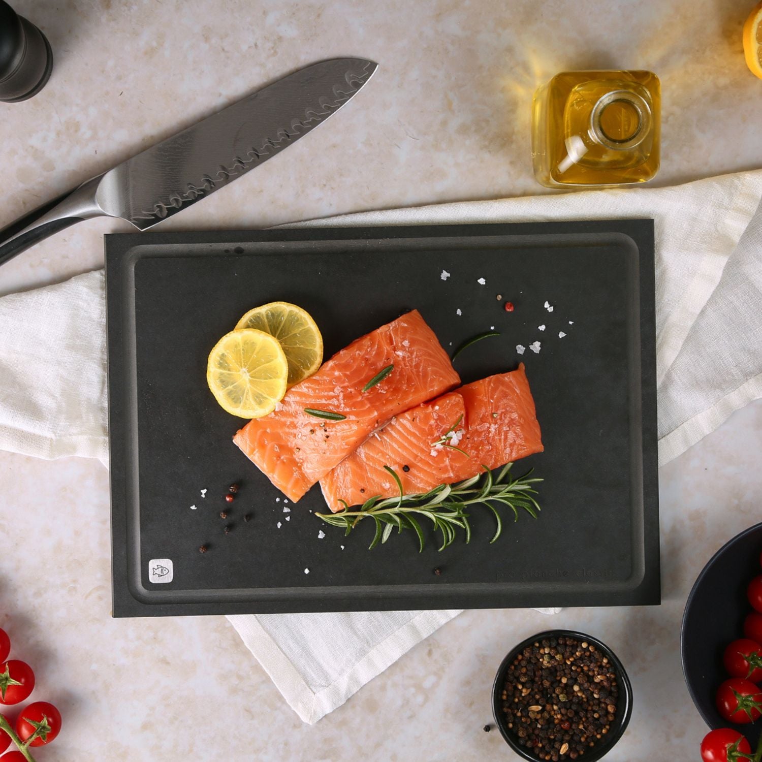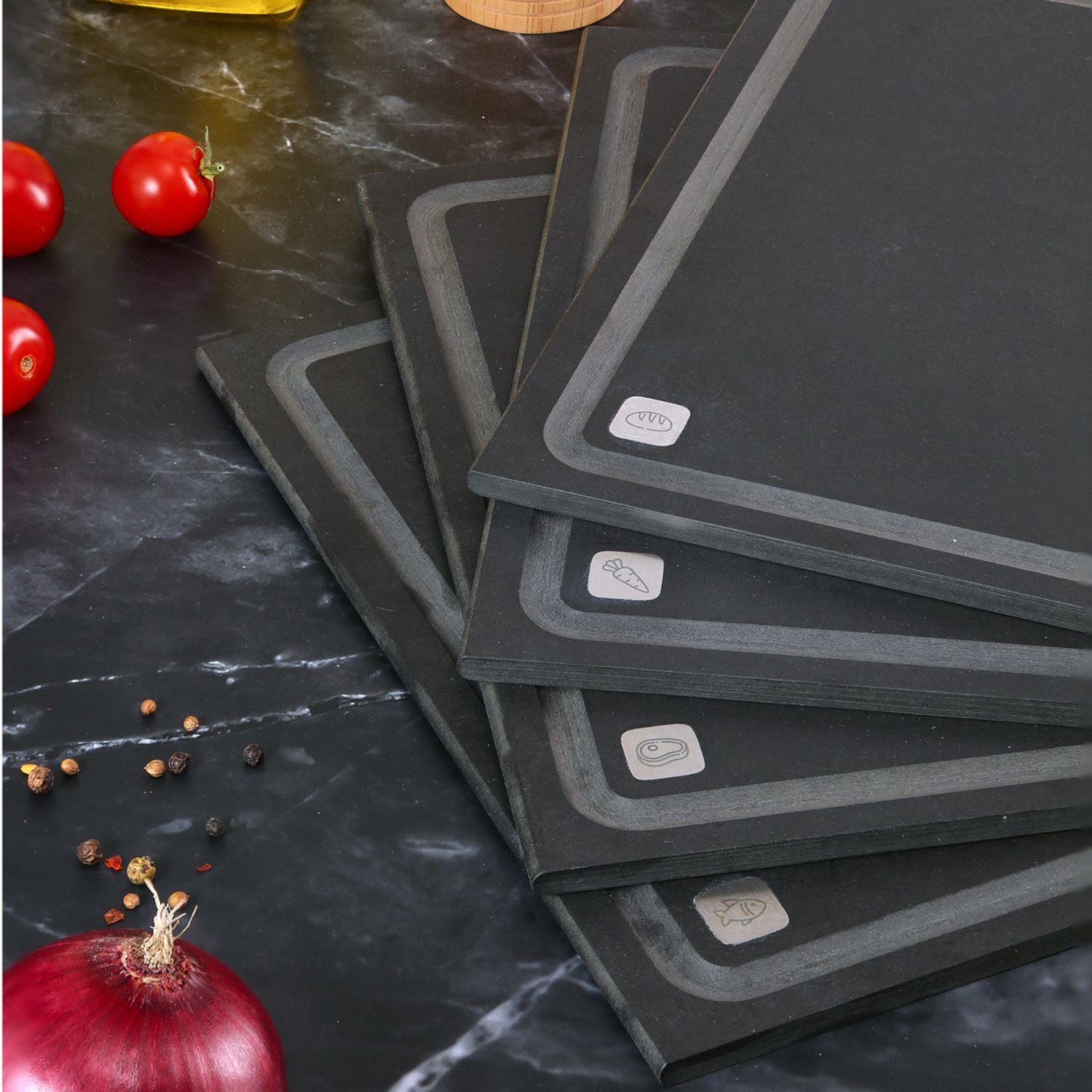 Die Symbole sind elegant und hochwertig auf Edelstahl in die Schneidbretter eingearbeitet und bieten so die moderne und schlichte Alternative zu farbcodierten Schneidbrettern.
