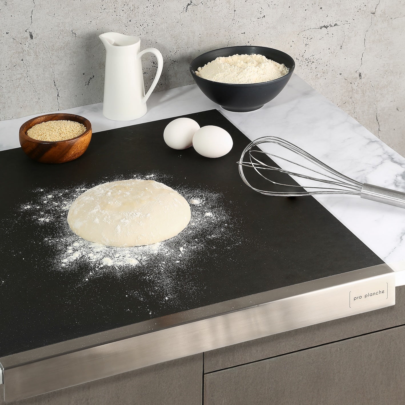 Durch die stabile Anschlagleiste aus Edelstahl und den perfekten Halt durch die mitgelieferte Korkmatte eignen sich die Mehrzweckbretter der pro planche 4 Series ideal zum Kneten und Backen.