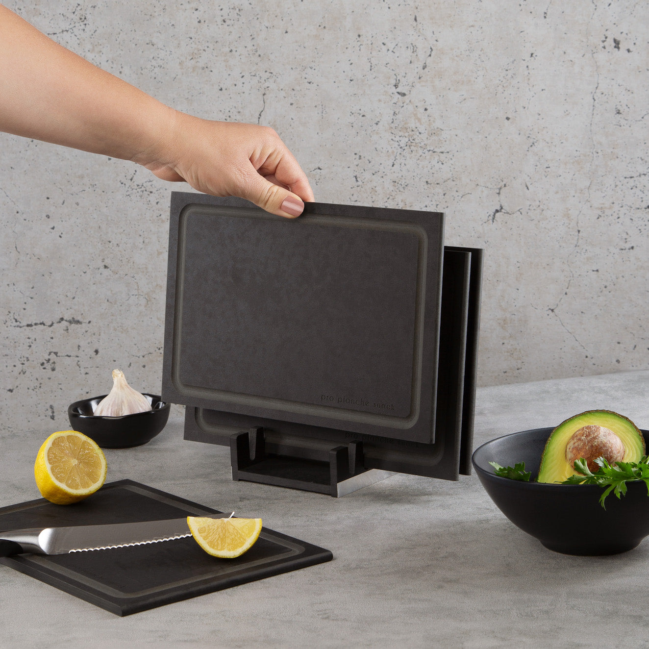 Der neue Schneidbretthalter "pro planche base" schafft endlich Ordnung in der Küche. Er bietet Platz für bis zu 4 Schneidbretter und darf in keiner Küche fehlen. Damit hast du deine "pro planche" Schneidbretter jederzeit griffbereit.